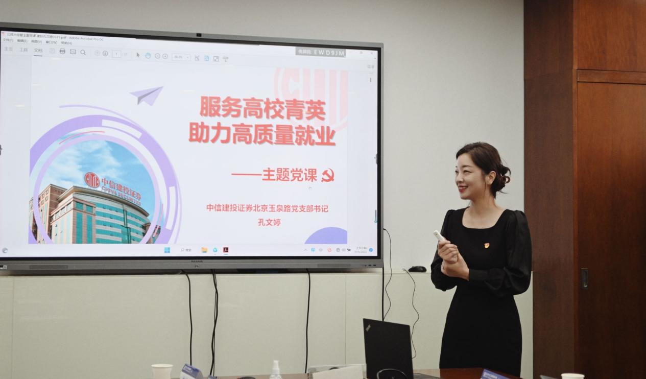 下半场,孔文婷总经理与同学们交流讲解,开展了一场内容充实的联学联建活动,以《服务高校青英,助力高质量就业》主题党课形式向同学分享了用人单位视角下2023年的就业形式、中信建投证券公司介绍、新员工培养计划、营业部介绍等内容。