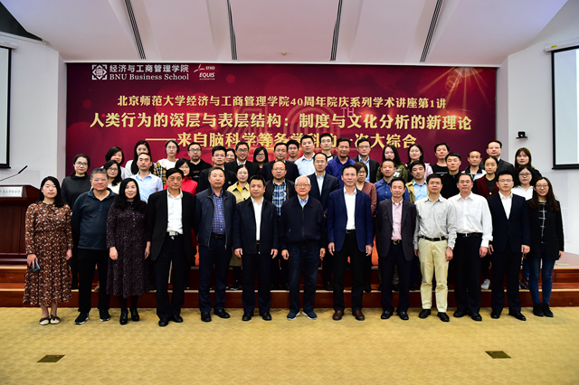 2019年4月22日,北师大bet365手机版 40周年院庆系列讲座第1讲顺利举办。本次讲座特邀著名经济学家、bet365手机版-bet365中文手机版下载 兼职教授吴敬琏先生担任主持嘉宾,江西省认知科学与跨学科研究重点研究基地主任、九江学院特聘教授罗来武作了“人类行为的深层与表层结构:制度与文化分析的新理论”的主题报告。国家能源局原巡视员孙耀唯、国家发改委国土开发与地区经济研究所原所长肖金成、《比较》编辑室副主编吴素萍、新加坡仁恒集团董事局主席钟声坚等政企学人士应邀出席了报告会。北京师范大学发展规划处处长赖德胜,bet365手机版 院长戚聿东、党委书记孙志军、副院长崔学刚以及学院教师和学生代表参加了报告会。