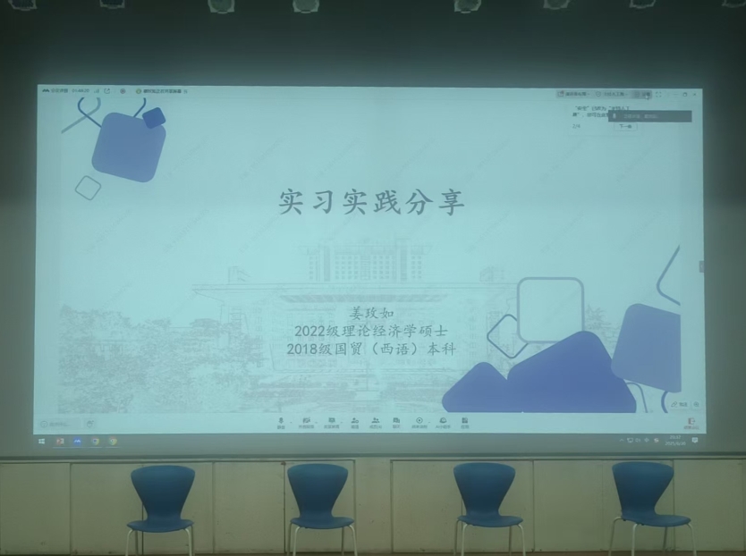 Subsequently, graduate representatives of our School shared their internship experiences. Li Yingjue, a 2025 undergraduate graduate in accounting who is planning to study at the Peking University School of Transnational Law, based on the internship exploration process, suggested that undergraduates should seize the opportunity to try and error, and bravely try multiple directions before delving into a specific field. Wang Haoning, a 2023 master's graduate in finance who is now working at the headquarters of the Export-Import Bank of China, systematically sorted out the internship matrix of market-oriented financial institutions and quasi-institutional financial institutions, and encouraged students to understand themselves and the nature of the industry through internships, so as to lay a solid foundation for future employment. Kong Xiangyi, a 2022 undergraduate graduate in finance who is now working at China North Industries Corporation, emphasized that "internship is not a universal key to job hunting", reminding students to clarify the purpose of internship, pay attention to improving the effectiveness of internship, and strengthen mental state management during periodic fluctuations. Song Jilong, a 2023 undergraduate graduate in economics who is planning to work at the headquarters of the Industrial and Commercial Bank of China, focused on the quasi-institutional track, emphasizing the need to improve policy sensitivity, enhance soft internship and written interview skills, tell good job-hunting stories, and pointed out that quasi-institutional employment requires focusing on cultivating market-oriented thinking. Jiang Meiru, a 2025 master's graduate in world economics who is planning to work at the headquarters of a state-owned bank, carefully explained the key points of study and internship at each stage of university, and emphasized the importance of internship planning and review and reflection by sharing the gains and experiences from each internship.