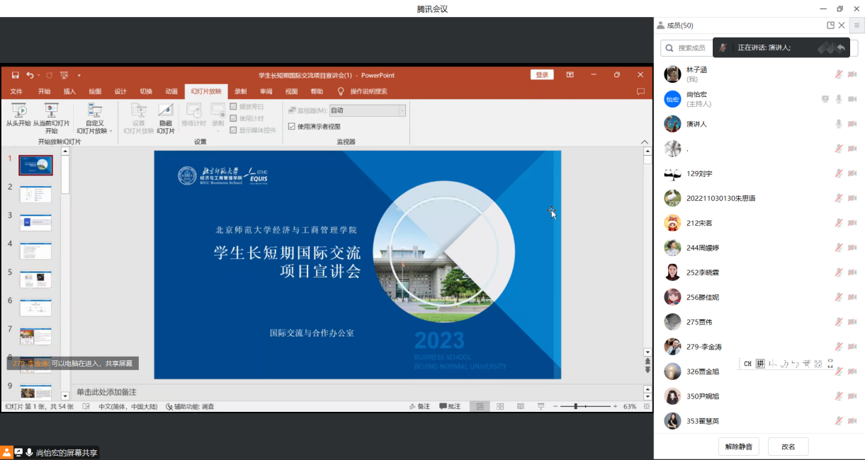 随后,尚怡宏围绕院级双学位项目、交换生项目、短期交流项目、申请流程、学院资助、校内审批等六个方面进行了介绍和讲解。会议互动交流与答疑环节,参会的同学踊跃提问,老师进行了详细的解答。