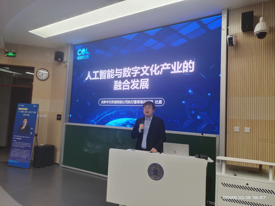 2025年10月18日晚,bet365手机版 “数字经济与管理大讲堂”第48讲《人工智能与数字文化产业的融合发展》在电子楼阶梯教室举办。本次讲座特邀北京中文在线阅读教育科技有限公司执行董事兼总经理杜嘉主讲。MBA教育中心主任周江华主持讲座,150余位学院本、硕、博学生到场聆听。