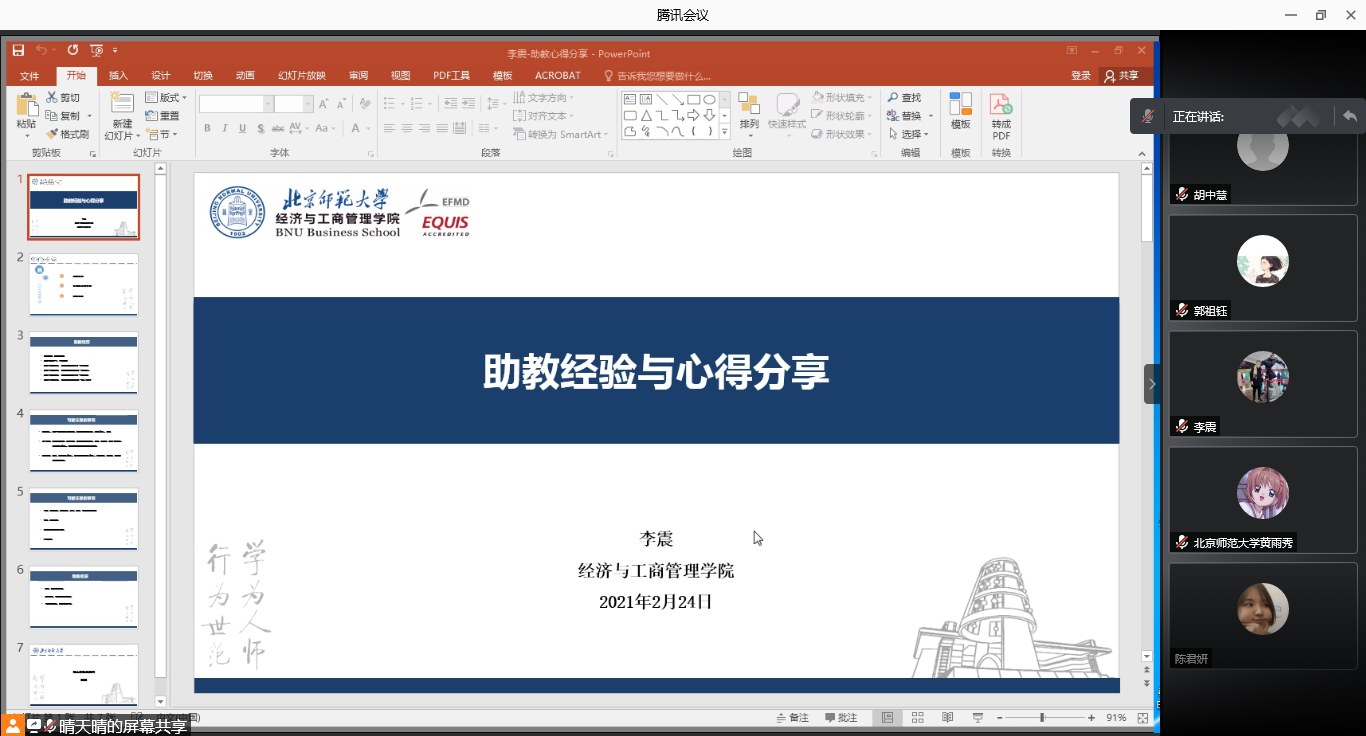 2021年2月24日,为促进学风建设,进一步提升课程助教的工作质量,促进2021年春季学期线上和线下助教工作的顺利开展,bet365手机版 根据教学管理工作计划,如期举办了课程助教工作经验分享会。考虑到疫情防控的要求,本次分享会采用腾讯会议的形式在线上进行。出席本次会议的有主管本科和研究生教学管理工作的副院长张平淡老师、本科教务徐星和杨海佳老师、学硕博研究教务李瑛淑和邹锐老师、MBA教务张丽老师,以及担任本科、学硕博研究生和MBA课程的64名课程助教参加。