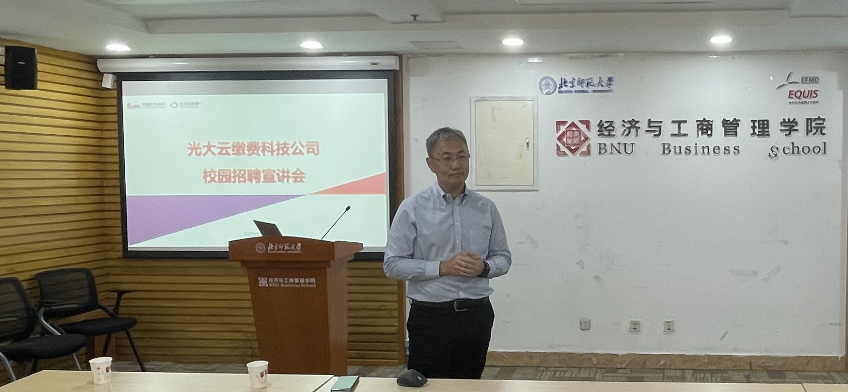 2023年9月13日,北师大bet365手机版 与光大云缴费科技有限公司联合开展“云聚梦想,青春费腾”主题讲座,面向我院全体师生宣讲2023年实习生联合培养项目。此次宣讲会邀请光大云缴费科技有限公司人力资源部经理李根、李思默为主讲嘉宾,面向各年级学生,对公司概况与实习项目进行介绍,充分调动了同学们参与实习项目的积极性。参与此次会议的有学院党委副书记江婕,双肩挑辅导员李论,以及我院各年级学生。