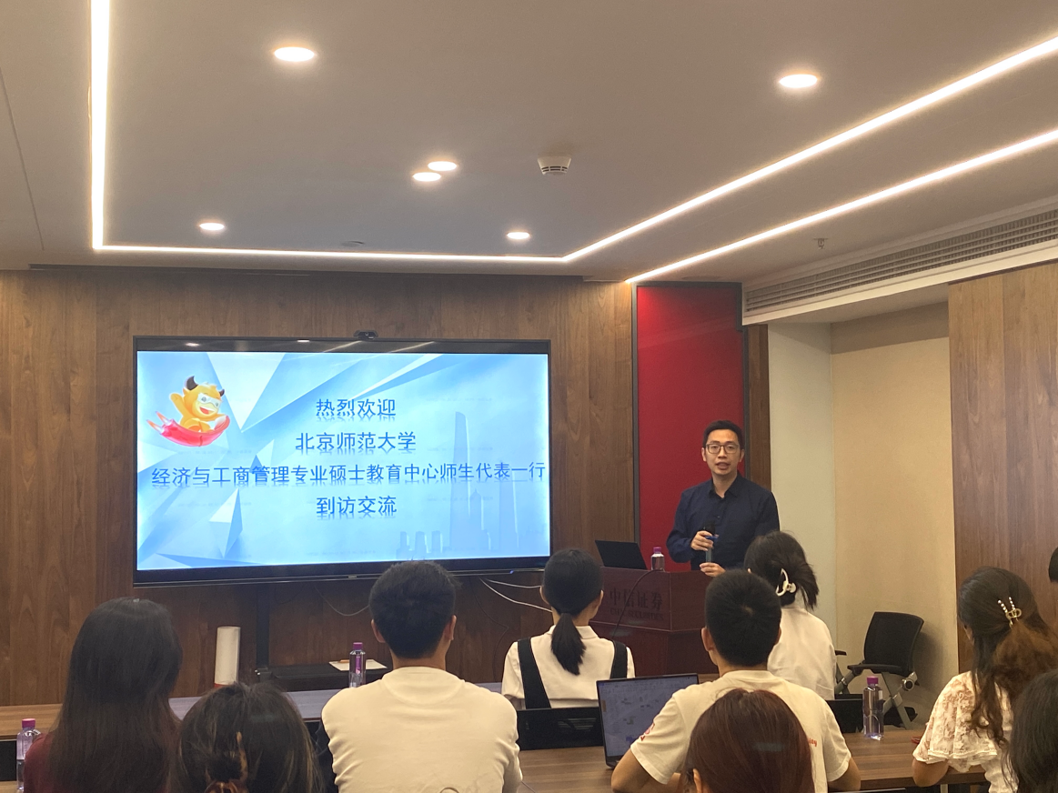 曾紫磊首先对中心师生一行的到来表示热烈欢迎,并介绍了中信证券华南股份有限公司的发展历程。他还分享了自己在证券行业任职10多年的心得,他认为在证券行业工作不仅职业发展天花板高,还非常有趣以及充满挑战性,需要不断学习新的知识和技能充实自己。他期待有更多志同道合的同学们投身证券行业,践行金融报国。郑越向同学们详细介绍了证券行业的发展现状,并重点讲解了证券金融知识和财富管理业务,引发了同学们的浓厚兴趣,帮助同学们充分了解证券公司的职能和业务。人事经理杨佳俊从招聘要求、培养阶段、岗位发展空间和成长机会、交流机会以及校招生培训等方面对人才培养计划进行了全面解读。