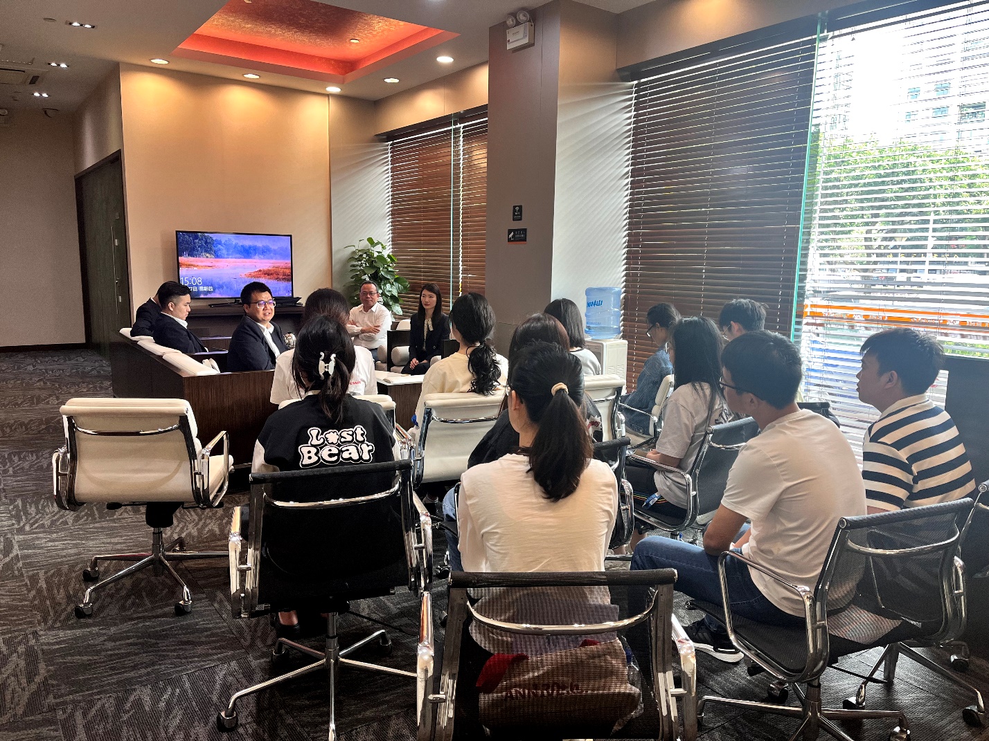 随后,新香洲一级支行的廖国旺行长,王硕、李殷弘副行长,九悦支行邱娟梅行长为同学们介绍了华润银行的发展历程、特色金融业务及后续发展规划,并与同学们进行座谈交流。